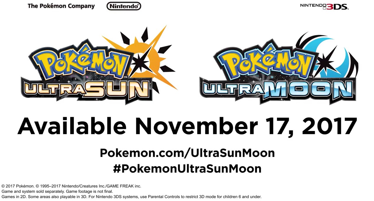 Pokémon Ultra Sun/Pokémon Ultra Moon estará disponible para el Nintendo 3DS. En estás nuevas versiones aparecerán formas alternas de Solgaleo y Lunala, los cuales de momento se desconocen los roles que tendrán dentro del juego. Será una historia alterna a la de Pokémon Sol/Luna en donde aparecerán Pokémon que no salían nativamente en estas versiones (¡probablemente eso signifique que salgan nuevas formas Alola!). Saldrá a la venta el 17 de noviembre del 2017.
